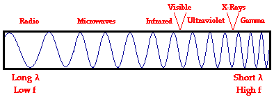 Electromagnetic waves exist with an enormous range of frequencies. This continuous range of frequencies is known as the electromagnetic spectrum. The entire range of the spectrum is often broken into specific regions. The subdividing of the entire spectrum into smaller spectra is done mostly on the basis of how each region of electromagnetic waves interacts with matter. The diagram below depicts the electromagnetic spectrum and its various regions. The longer wavelength, lower frequency regions are located on the far left of the spectrum and the shorter wavelength, higher frequency regions are on the far right. Two very narrow regions within the spectrum are the visible light region and the X-ray region. You are undoubtedly familiar with some of the other regions of the electromagnetic spectrum.